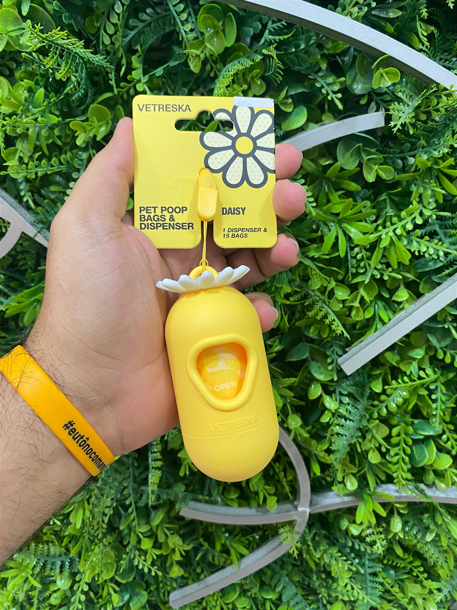 O conjunto inclui um dispensador estiloso adornado com margarida, adicionando um toque elegante e 1 rolo de sacos de cocô biodegradáveis.